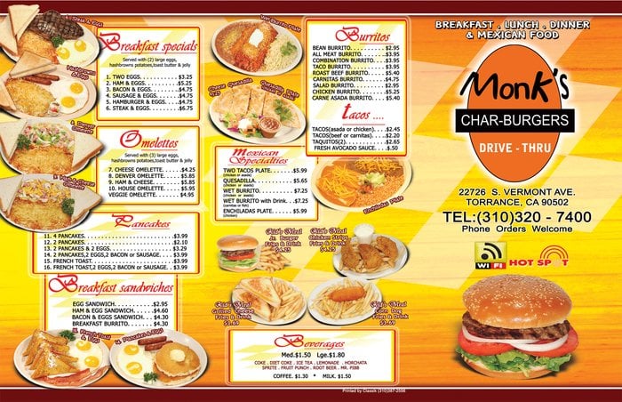 Monks Charburgers, located in Torrance, CA, offers a diverse menu featuring burgers, Mexican dishes, and breakfast options. The restaurant provides various amenities such as takeout, delivery, and outdoor seating. Customers rave about the Colossal burger, chili cheese fries, pastrami, and bacon breakfast burritos. The friendly staff and quick service make dining here a pleasant experience. Monks Charburgers is known for its flavorful ranch dressing, perfectly grilled burgers, and tasty chili cheese burgers. Prices are reasonable, and the casual ambiance makes it a great spot for families and groups. For a satisfying meal with excellent customer service, Monks Charburgers is a must-visit.